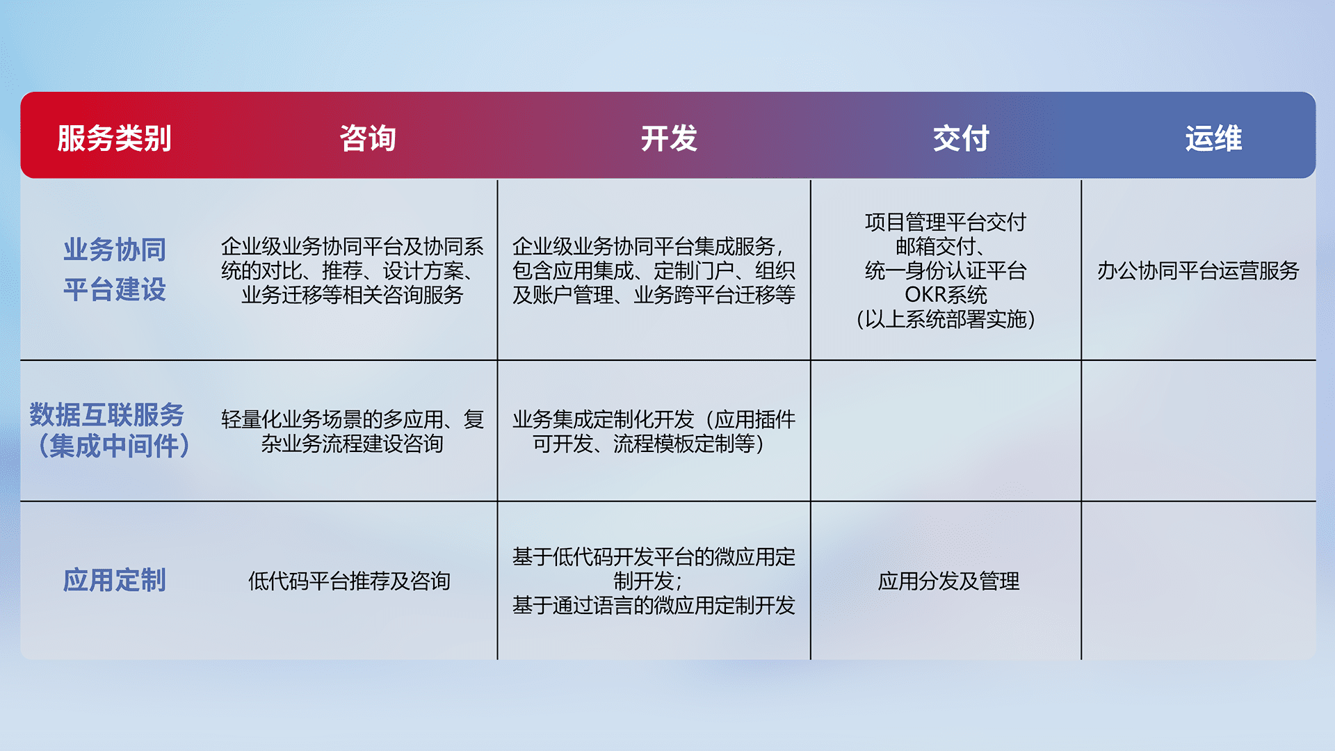 针对钉钉、、、、企微、、IDaas等平台级产品提供产品的规划、、、方案、、、、交付、、、、定制化开发等服务,,,实现如统一协同办公、、、智能客户服务、、混合会议管理、、智能数据查询、、、等业务场景,,,实现数字化转型。。。。